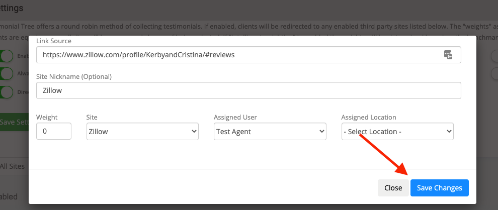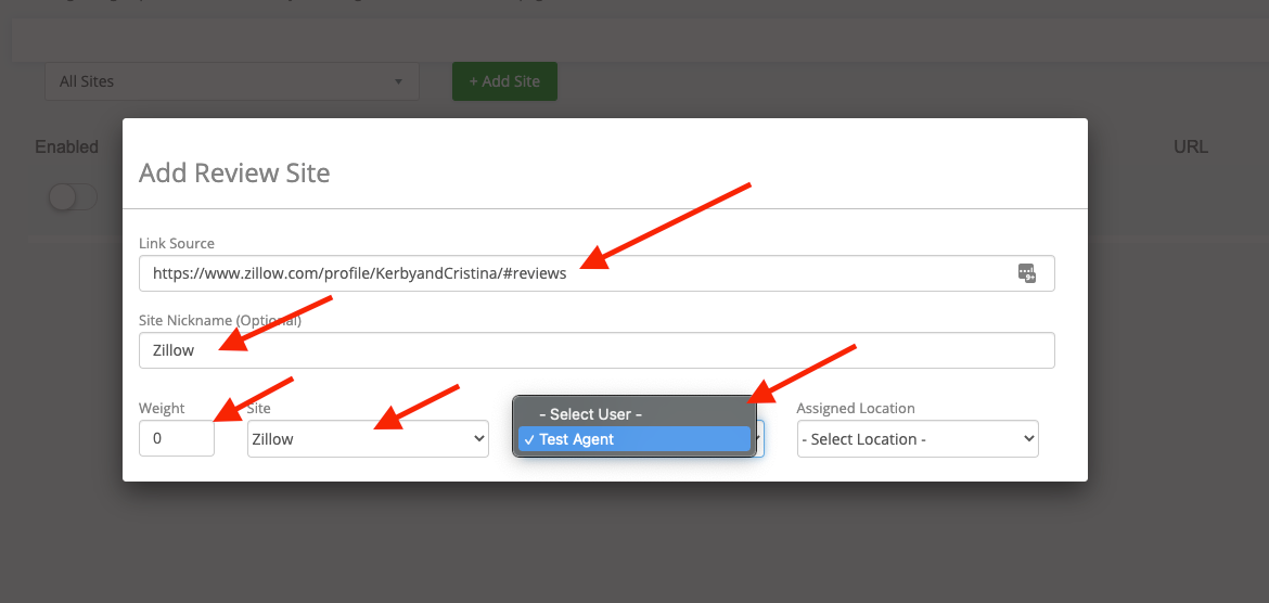 8. Go back into Testimonial Tree and paste the Zillow link in "link source" Add "Zillow in "Site nickname" Add Weight "0" Choose Zillow as your "site" and select your name in the "Assigned User" dropdown